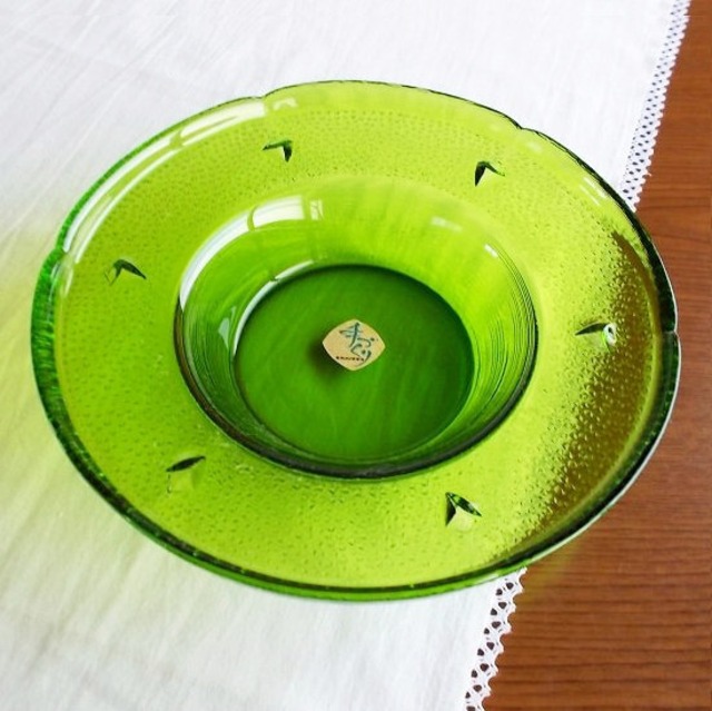 昭和中期には、色ガラスのどっしりとした灰皿がとても流行しました。今では灰皿はあまり使われなくなってきていますが、とてもきれいなグリーンですので、テーブルセンターに飾ったり、水をはって水盤に、お花をいけてみても面白いかもしれませんね♪