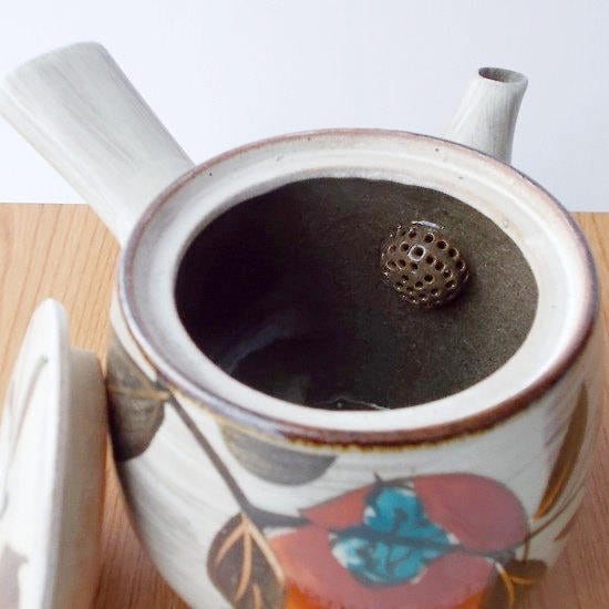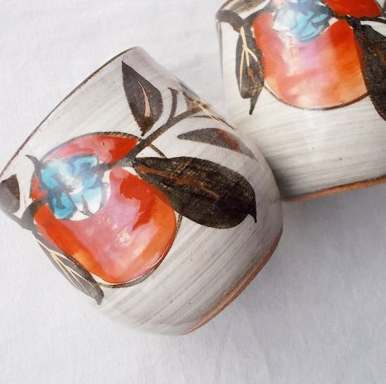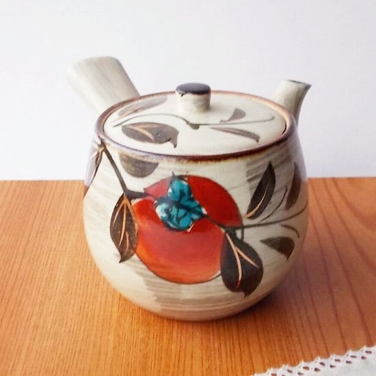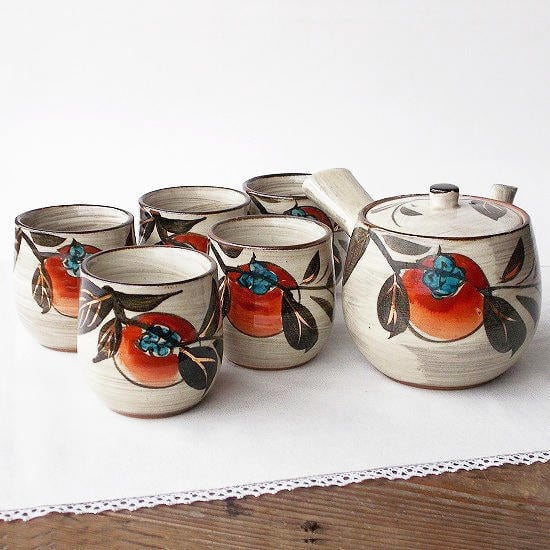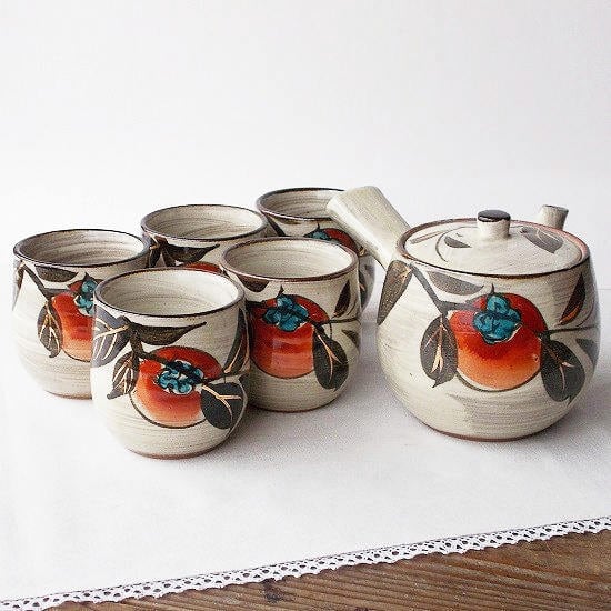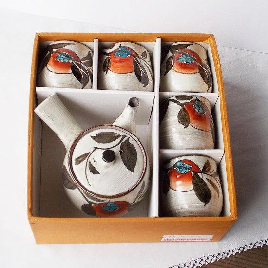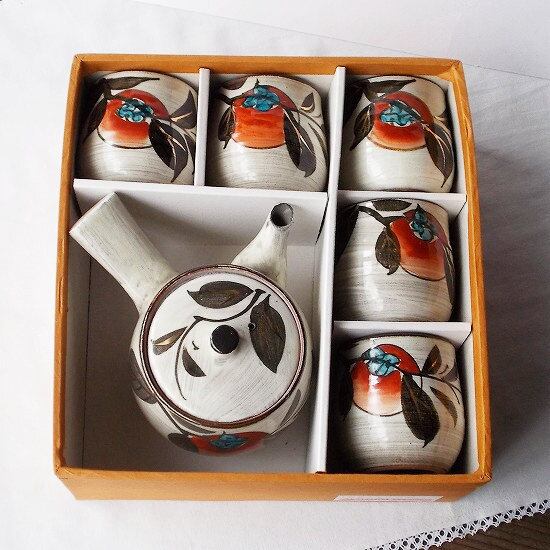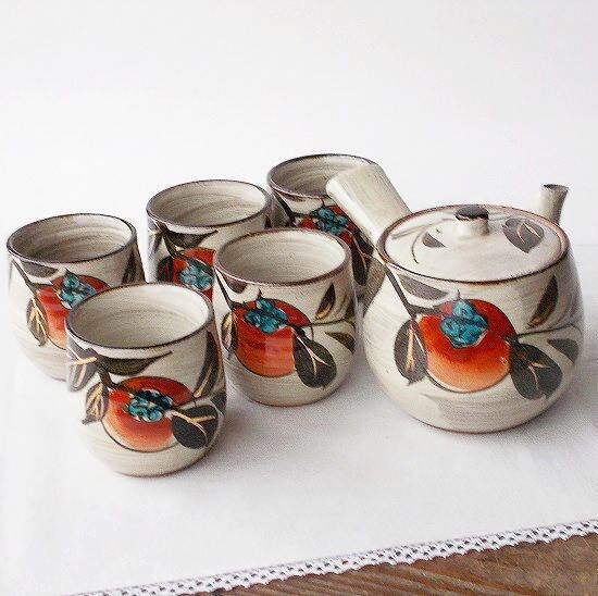 昭和レトロな民芸風ブラウン系白刷毛目赤い柿の実の茶器セットです。