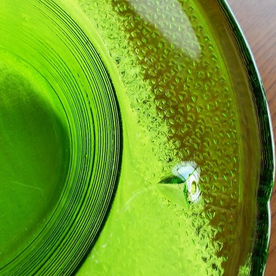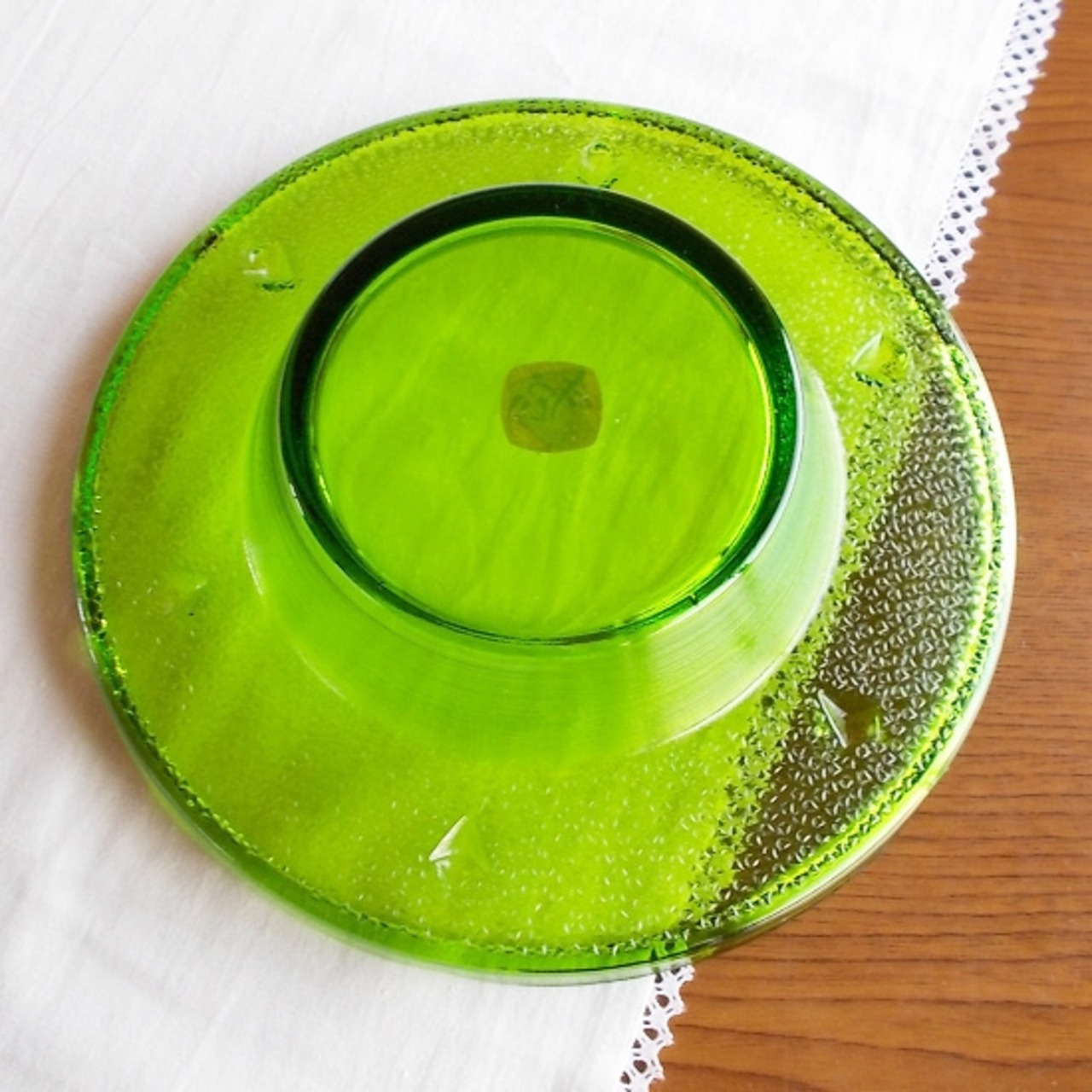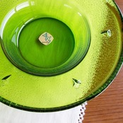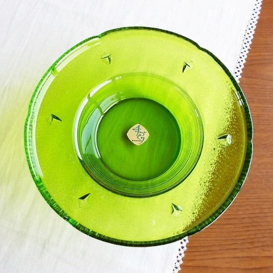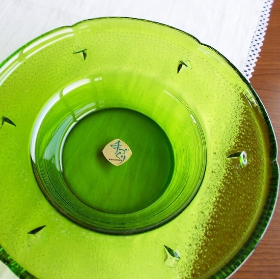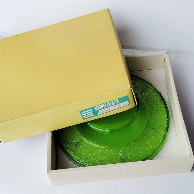 昭和中期には、色ガラスのどっしりとした灰皿がとても流行しました。今では灰皿はあまり使われなくなってきていますが、とてもきれいなグリーンですので、テーブルセンターに飾ったり、水をはって水盤に、お花をいけてみても面白いかもしれませんね♪