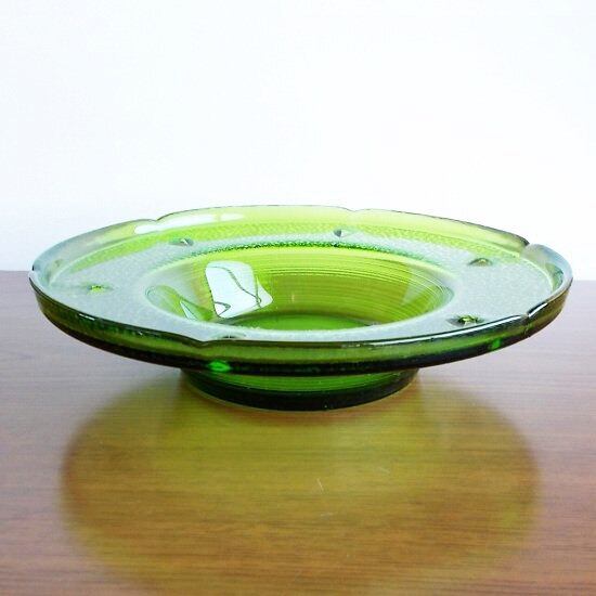 カメイガラス/昭和レトロ涼しげなグリーンガラス円形平たいガラスの灰皿
