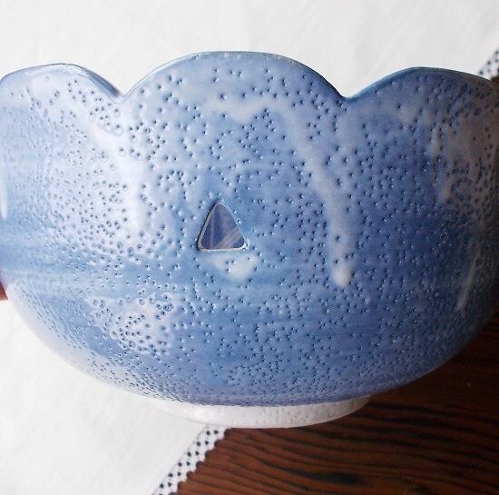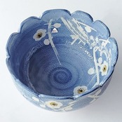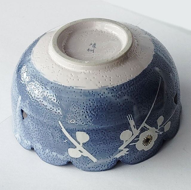 とても粋な志野風のポッポッとした表面の風合い、水色に白い砂糖菓子がかかったような風合いが面白い花形の鉢です。