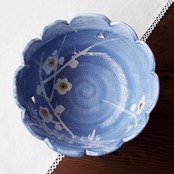 水色白抜き梅花枝図柄志野風花形菓子鉢です。