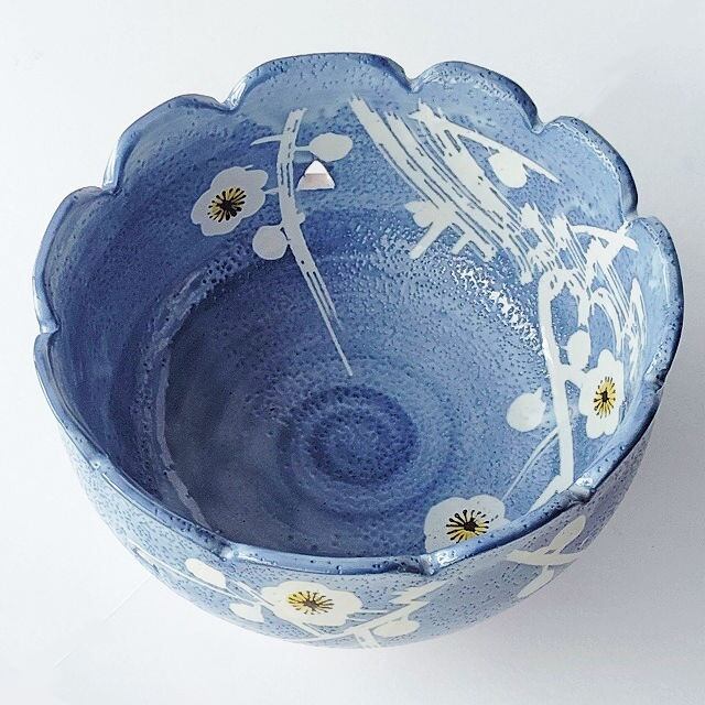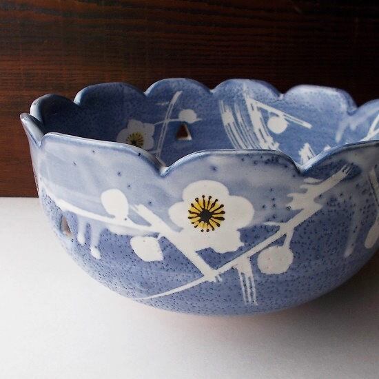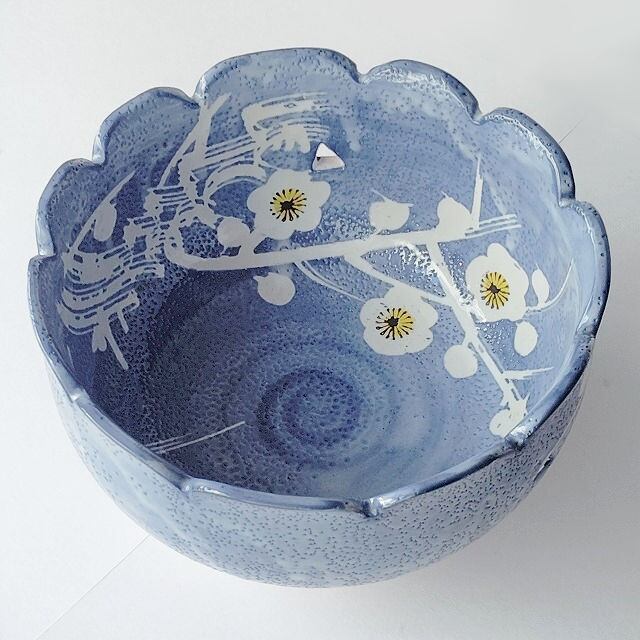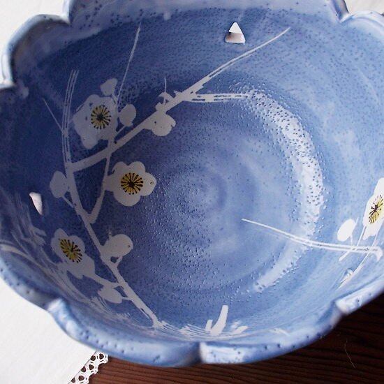水色白抜き梅花枝図柄の志野風花形菓子鉢