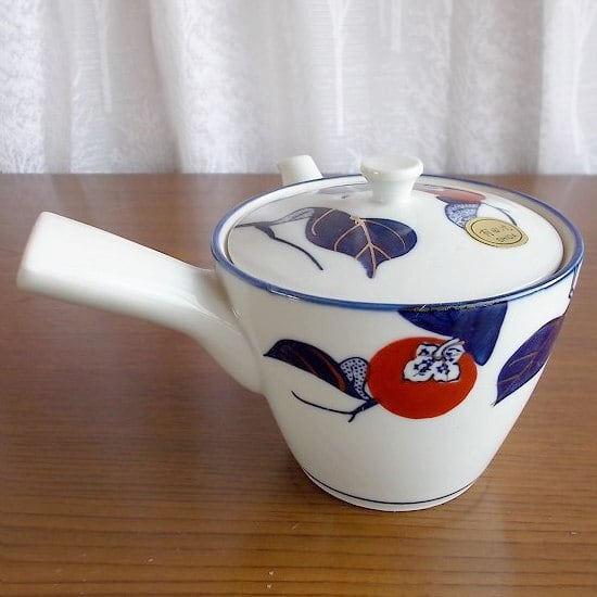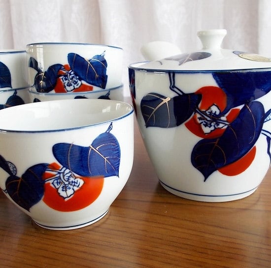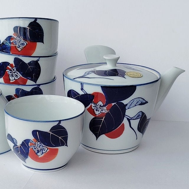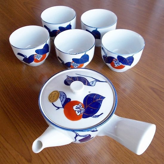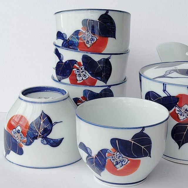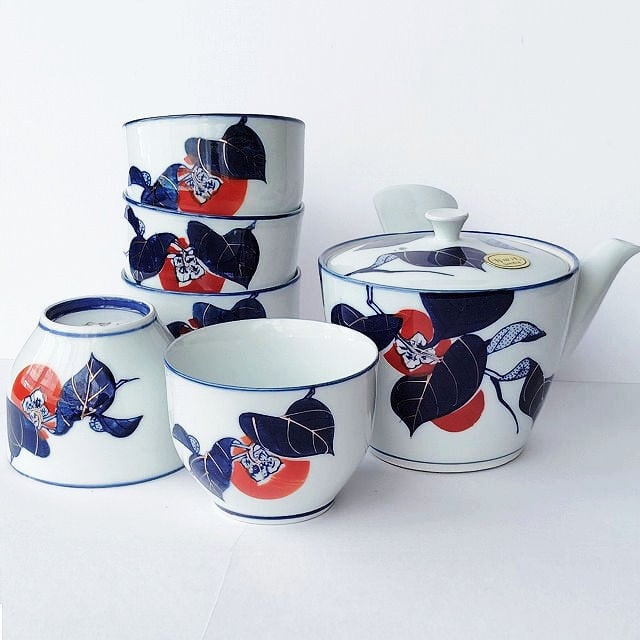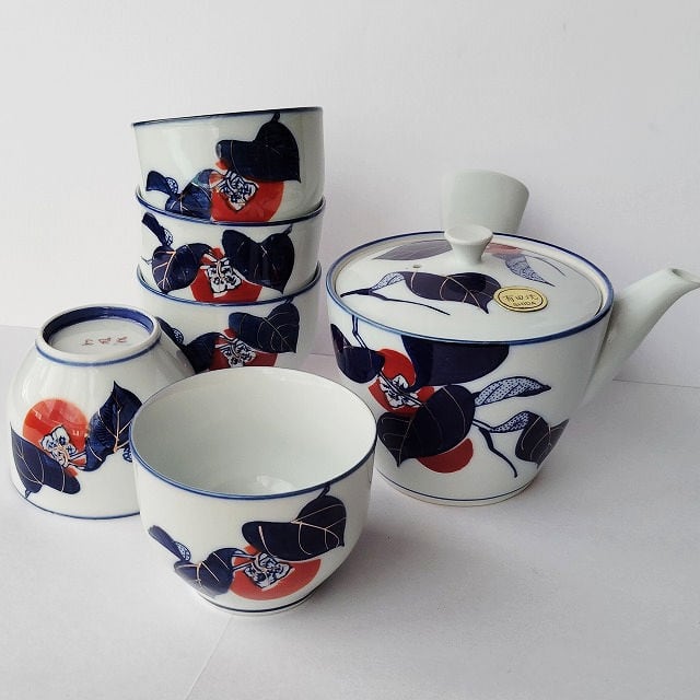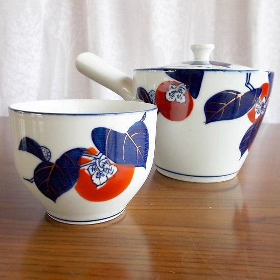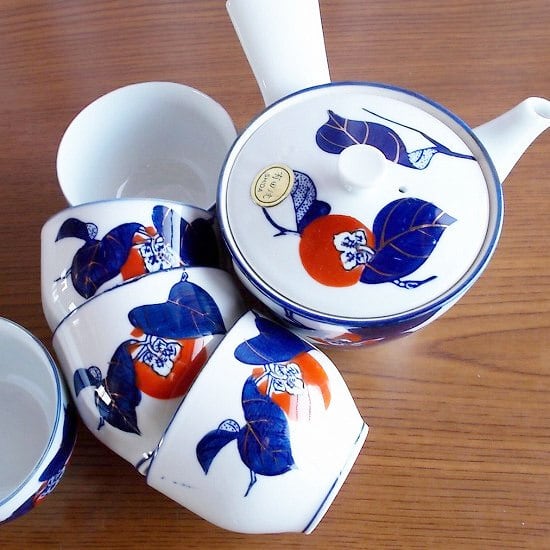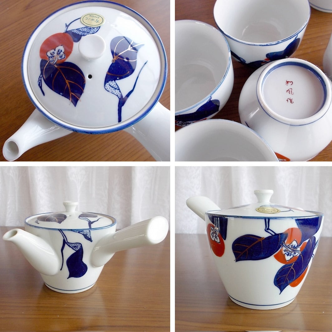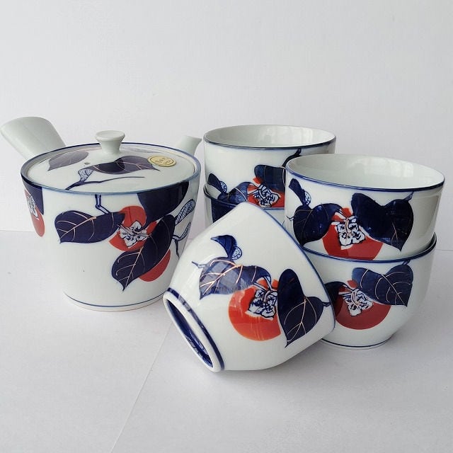 有田焼き紺金赤色の柿の柄の茶器セット