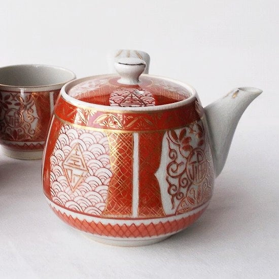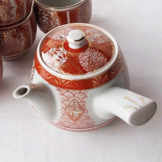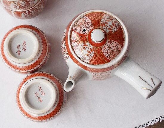 アンティークな雰囲気漂う九谷焼茶器セット/金赤絵福寿唐草青海波