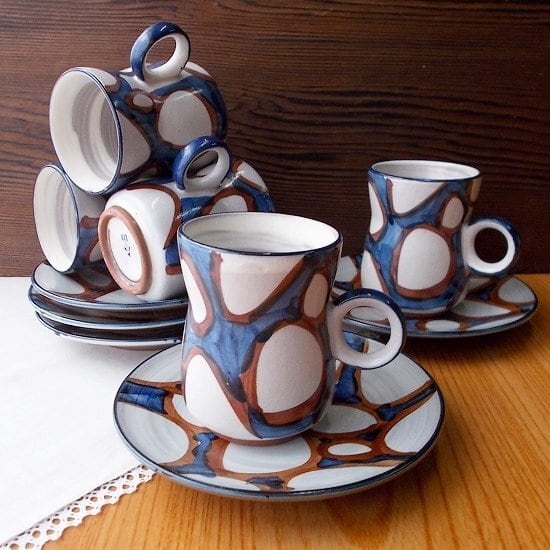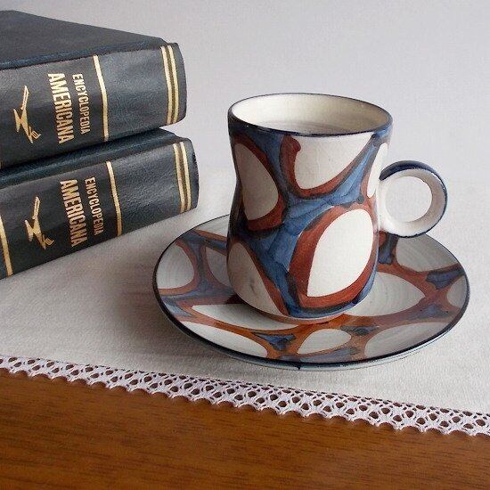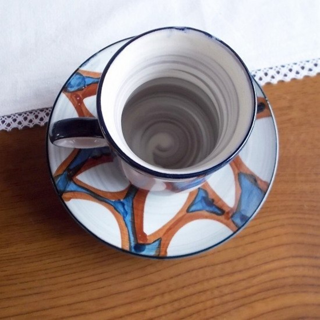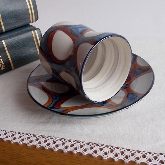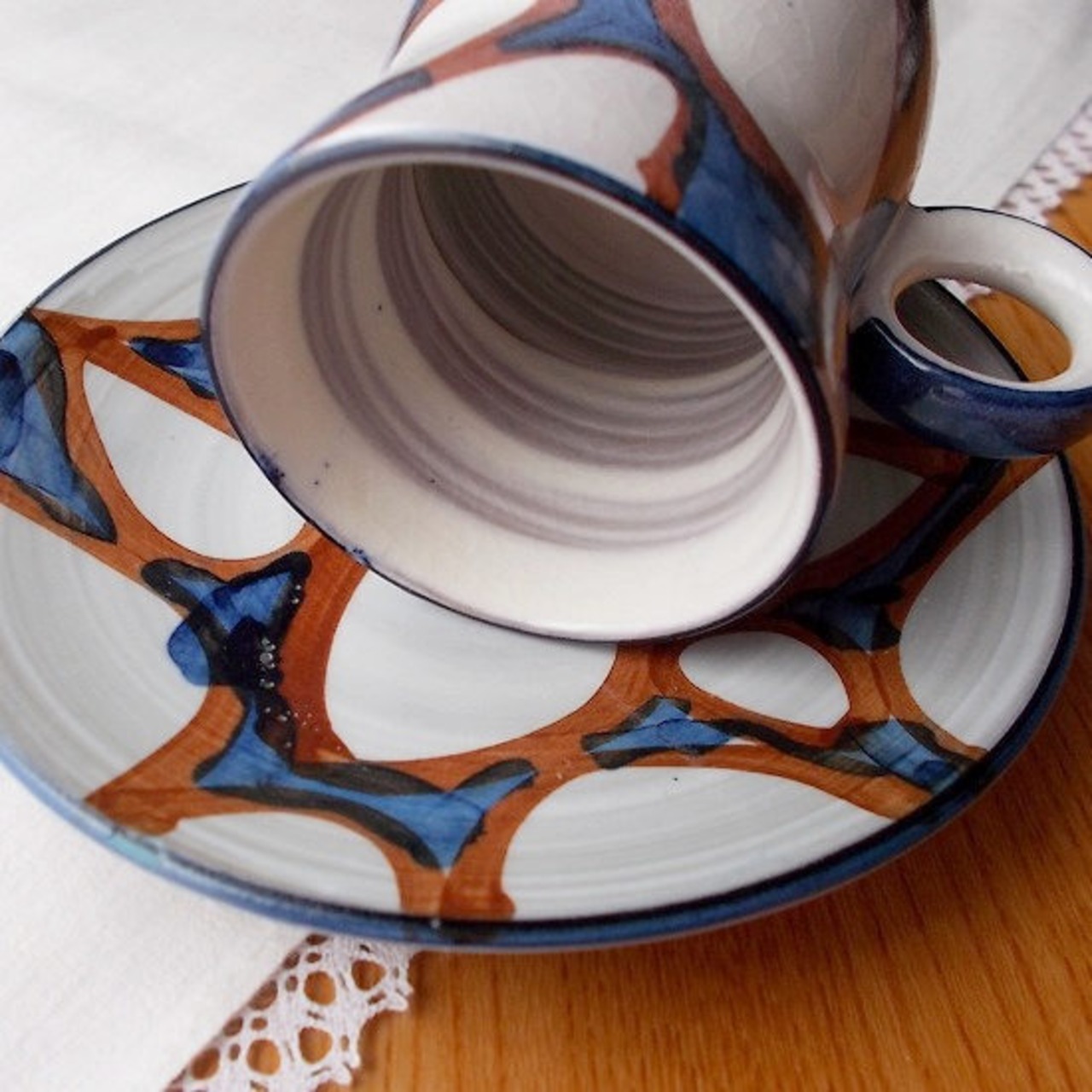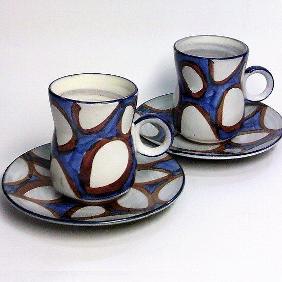 面白いフォルムの和風デミタス♪和風な柄と、個性的なフォルムが可愛らしい、デミタスサイズのコーヒーカップ&ソーサーです。ブルーと茶色の組み合わせがシックでカッコいいですよ。置いてあるだけでも独特の雰囲気をもつ、絵になるカップです。